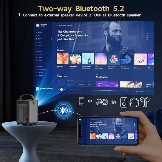 这款便携式电影投影仪通过人工智能技术,带来智能影院娱乐体验。具有电动对焦和 4D/4P 梯形校正功能,可在2秒内精准获得清晰图像。投影仪采用先进的 2.0 三色激光光学元件,分辨率高达 1080P,最高可支持4K视频。支持双频 WiFi 6 和蓝牙 5.3,配备 HDMI、USB、音频等多种端口,可与您的智能手机、笔记本电脑、游戏机或媒体播放器无缝连接。
