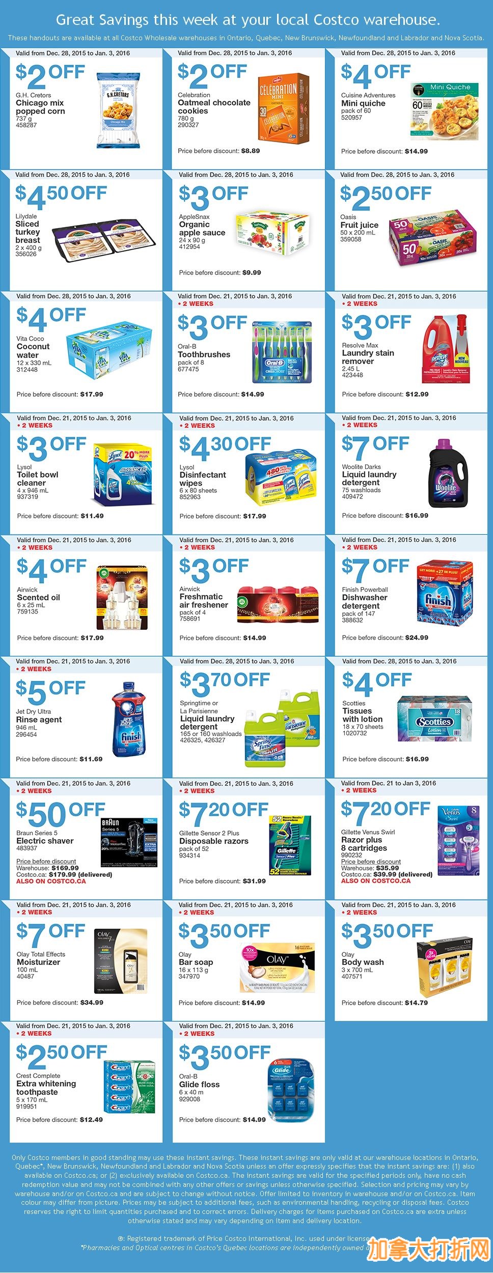 本组图于12月28日在多伦多Markham(Woodbine)店内拍摄,本周没有店内折扣海报,除常规减价促销外,价格以.97及.00结尾为清仓价,以.49及.79结尾为厂家促销价。拍摄的折扣(非清仓品)适用于加东省份的Costco店,加西及中部省份可能有部分不同。