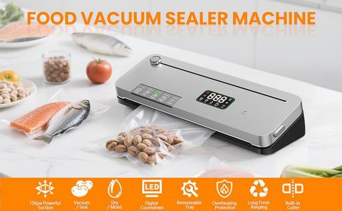 一款功能全面的六合一食品保鲜设备,适合家庭使用。机身采用紧凑可拆卸设计,便于清洁和存放,核心功能包括干/湿模式、可定制袋子尺寸的内置切割器、用于易碎食品的脉冲功能,以及可通过软管外接真空以密封罐子或容器。配备数字定时器和最高75kPa的强劲吸力,能够有效延长食物保鲜期。套装内含20个真空袋及吸气软管等配件,并提供售后支持。