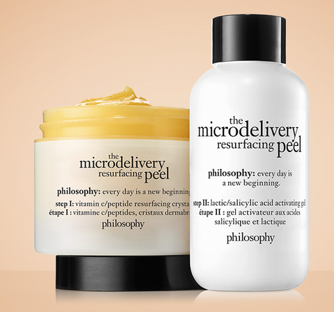 PHILOSOPHY the microdelivery 维C氨基酸微晶焕肤面膜组是品牌的明星级焕肤产品,采用创新双步骤护理,专为厚皮与痘痘肌打造,帮助刺激细胞更新、提亮肤色。第一步将维C氨基酸微晶敷在干燥肌肤轻柔按摩,使肌肤吸收亮肤成分;无需清洗,直接叠加第二步的水杨酸凝胶与维C磨砂膏混合按摩,产生温热感与细腻泡沫,停留 2–3 分钟后清洗即可。配方融合氨基酸与胜肽重塑肌肤通道、淡化细纹;维他命 C 与胶原成分提亮抗氧化;水杨酸深层清洁黑头与死皮,乳酸温和代谢角质同时保持水润,使肌肤更光滑透亮。效果强劲,敏感肌需谨慎使用。