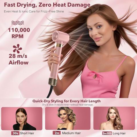 StyleVibe 六合一造型器集吹风机、吹风梳、自动卷发梳、快速干发、顺滑直发、蓬松发根等功能于一身,适用于所有发质,从直发到卷发皆可在家轻松打造沙龙级效果。高速 28m/s 气流实现快速干发并减少热损伤,搭配 5 亿负离子与陶瓷气流技术,令秀发顺滑亮泽、不易毛躁。具备 3 档温度、3 档风速及一键冷风,满足不同造型需求;左右自动卷发设计无需手动缠绕,安全省力。机身轻巧、线缆可旋转,并附隔热手套与旅行袋,是送给女性的理想造型礼物。