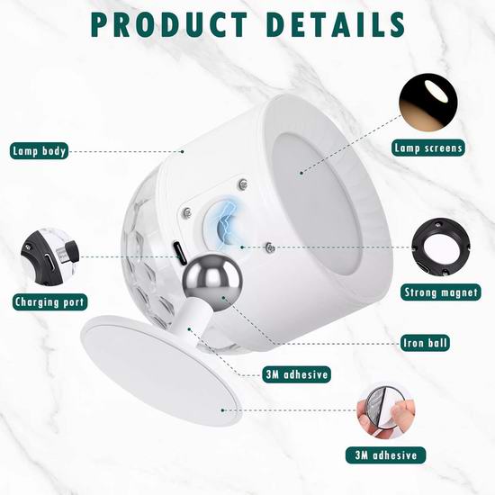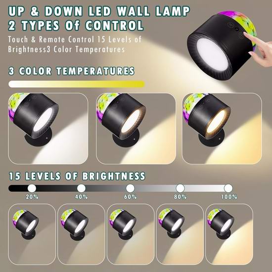 这款壁灯采用双头设计,支持3种白光模式和15种亮度调节,RGB彩色氛围灯还具有跳变、呼吸和闪烁3种模式,可为您营造缤纷多彩的氛围,适合任何派对或节日场合。内置升级版2500mAh可充电电池。充电只需不到3小时,在RGB最亮模式下可连续工作长达7小时,在壁灯最亮模式下可连续工作5小时;RGB低亮模式下可连续工作60小时,壁灯低亮模式下可连续工作40小时。支持触摸控制和遥控。使用遥控器操作可调光壁灯,可调节15级亮度、3种色温,可预设0.5小时/1小时/2小时自动关机时间。只需轻触无线LED壁灯的灯头,即可控制开关、调节亮度、调节色温,以及随心所欲地开启/关闭RGB灯光。配有磁性底座和强力双面胶,无需任何工具、螺丝或螺母即可安装。