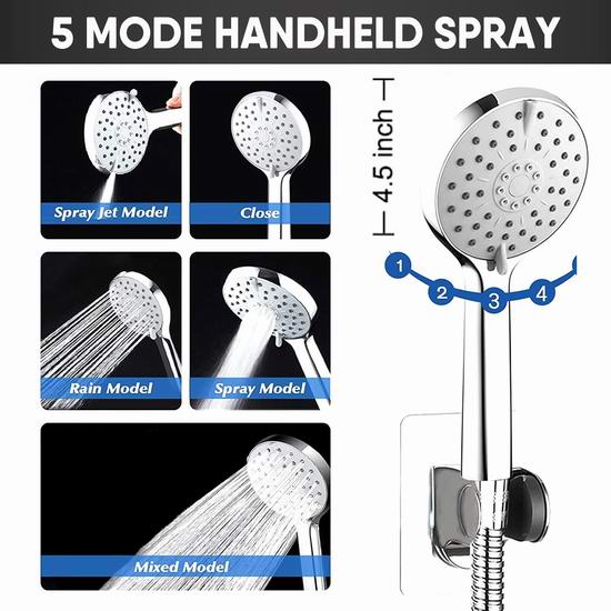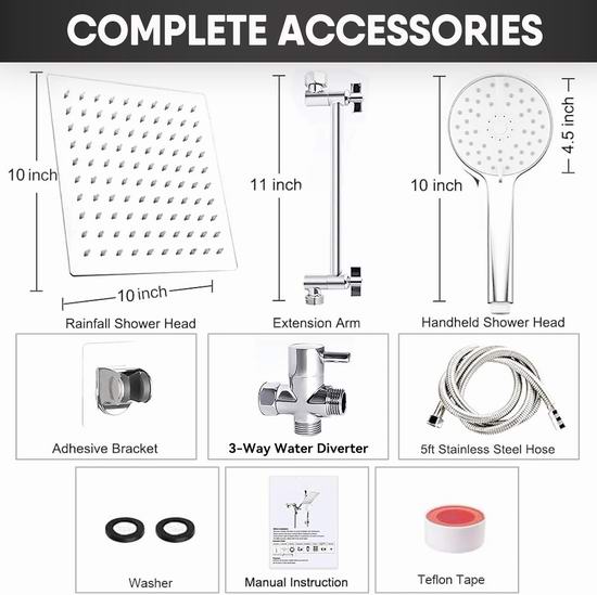 套装内含10英寸方形花洒淋浴喷头、4.5英寸5模式手持淋浴头、11英寸延长臂、5英尺水管、三通分流器、吸盘支架、特氟龙胶带和垫圈以及安装手册。拥有多种淋浴模式。雨淋式喷头、手持式喷头以及雨淋式+手持式喷头。10英寸方形雨淋式喷头让您沉浸在柔和雨水的舒缓感受中,轻松切换到便捷的手持式喷头,或尽情享受两者的结合体验。