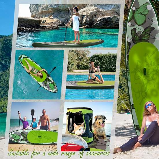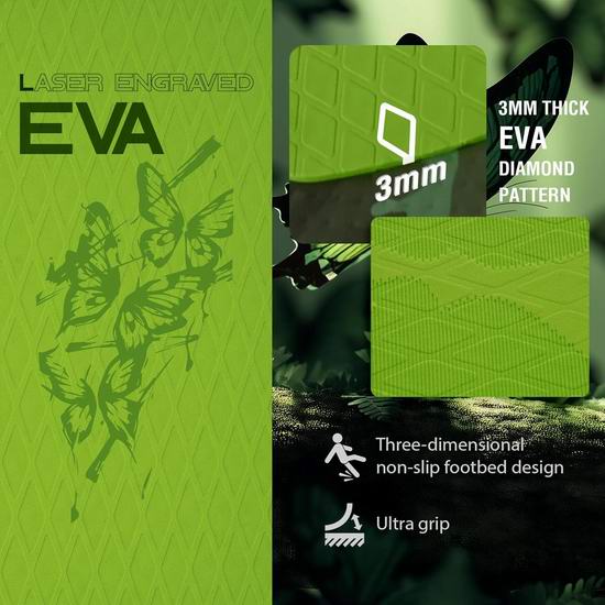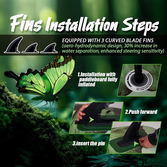 采用军用级PVC材料,撕裂强度提高50%,采用无缝热粘合工艺,消除了胶水泄漏的风险,可承受15PSI高压和极端水环境。表面激光雕刻3mm厚EVA菱形图案,摩擦系数高(≥0.6),潮湿仍保持强力抓地力,采用三维防滑脚垫设计,防止滑倒​​,拉力安全系数高。鳍片采用空气动力学设计,可将水流劈裂性能提高 30%,降低横向阻力,增强直线稳定性和转向灵敏度。配备单桨、章鱼扳手、手动气泵、10L半透明防水袋、3个砍刀形鳍片、补丁、桨板背包、脚绳。尺寸为320*83*15厘米,承重高达330磅;放气后可折叠成背包大小,方便单手携带。
