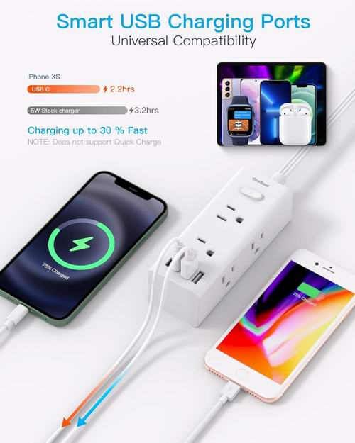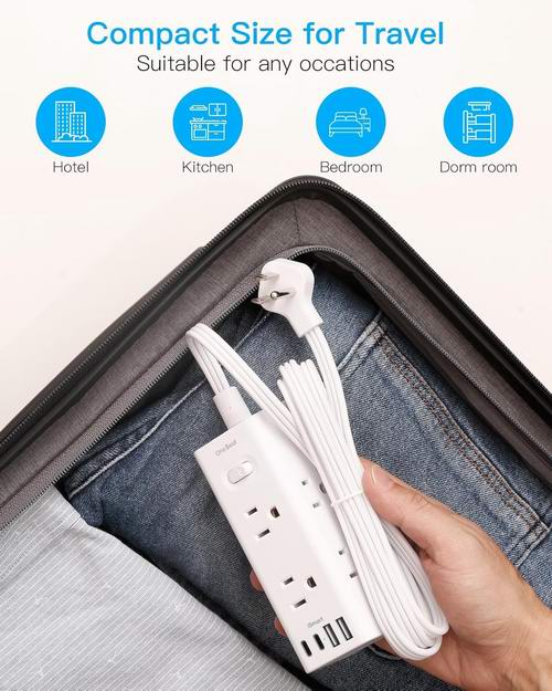 这款插线板内置6个交流电源插座、2个USB-A接口和2个USB-C接口,可同时为多达9台设备充电。USB-C接口最高支持5V/3A充电,2个USB-A接口最高支持5V/2.4A充电,所有USB接口输出均为5V/4.5A。具有900焦耳的能量防护,可提供可靠的电源延长线,保护您的电子设备免受过载、短路、电压尖峰、雷击或电压波动的影响。插头厚度仅为 0.35 英寸,采用 45 度直角设计,比传统插头更纤薄,可轻松贴合墙面,隐藏在家具、床或冰箱背面,不占用插座空间。10 英尺长延长线,采用纯铜材质,具有更高的载流能力(15A)。