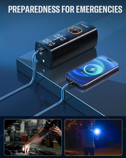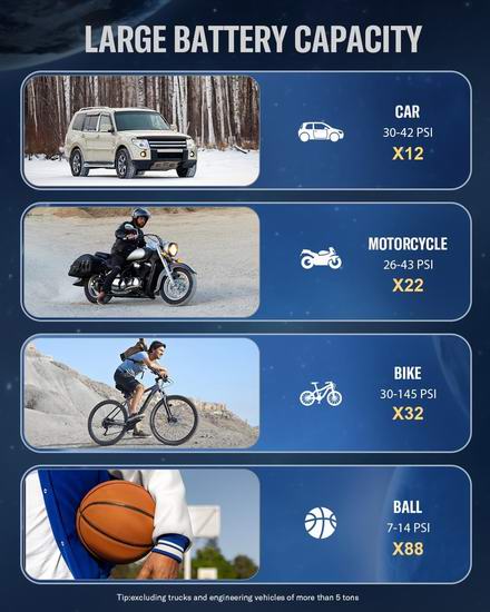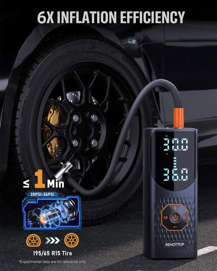 搭载强劲电机和高性能芯片,可提供高达160PSI的最大压力和36升/分钟的气流。可在不到1分钟的时间内将标准汽车轮胎的气压从28PSI充至36PSI,充气速度比其他产品快6倍。具有4种预设模式,分别适用于汽车、摩托车、自行车、球类和自定义充气。还可以根据需要轻松选择 4 种压力单位(PSI、Bar、kPa、kg/cm²)。自定义模式允许您根据要充气的物品自由预设所需的压力值(3-160PSI)。内置数字胎压计和大型LED数字显示屏,让您一目了然地读取实时胎压和预设胎压。配备高容量可充电电池,无需频繁充电即可长时间使用。顶部设有LED灯,可用于在黑暗中充气、更换轮胎或在夜间提醒其他车辆。顶部还设有C型充电接口和5V/2A USB输出接口,为其他设备应急电源。