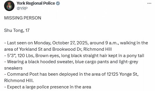 10月27日,安省烈治文山(Richmond Hill)社区发生一起青少年失踪事件。约克区警方正紧急寻找一名17岁华裔少女 Shu Tong。