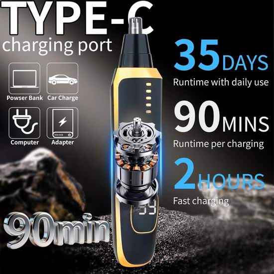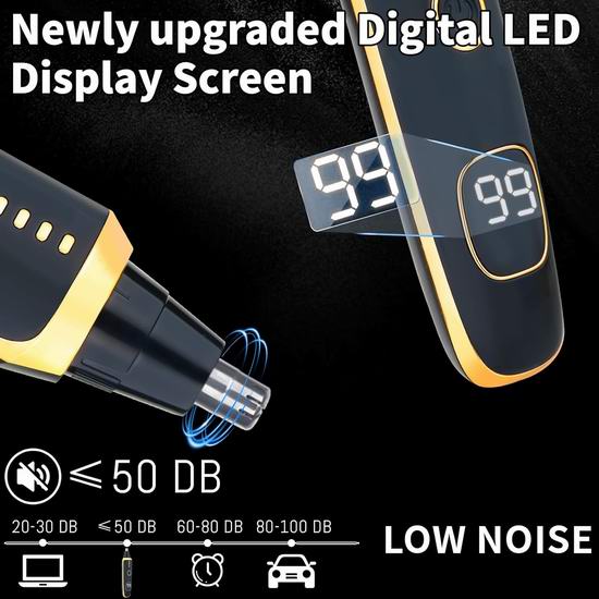 这款二合一鼻毛/耳毛修剪器配备可互换的修剪刀头,专为修剪鼻毛、耳毛、眉毛、胡须边缘和面部杂毛而设计。配备锋利的双刃刀片和360°旋转切割系统,确保修剪顺畅无痛,避免拉扯。内置LED屏幕清晰显示剩余电量,低噪音技术最大限度地减少了嗡嗡声。内置可充电电池,续航时间长达35天。