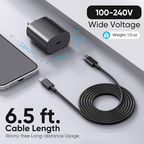这款 USB C 充电器具有多重安全保护机制,包括过充、过热、输入过流、输出过流和短路防护,确保充电过程稳定安全,内置智能识别芯片,可自动检测设备所需的最佳充电电流,优化电池健康。配备 6.6 英尺防缠结 TPU 充电线。