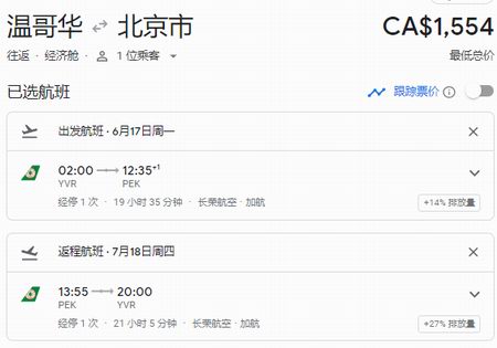温哥华往返北京暑期票价低至1554加元: