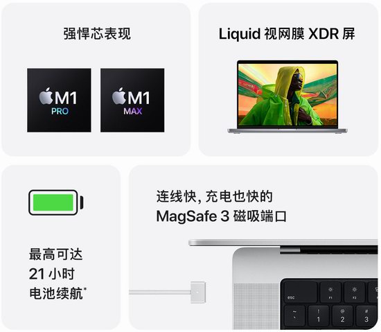 新款MacBook Pro搭载 M1 Pro 和 M1 Max 芯片,使用体验将带来颠覆性变化。MacBook Pro提供 14 英寸及 16 英寸两种规格,16 英寸机型的显示屏尺寸达到 16.2 英寸,包括 770 万颗像素,是 Mac 笔记本电脑迄今为止像素最多的显示屏。14 英寸机型也为用户带来了更宽大的屏幕,显示屏尺寸达到 14.2 英寸,包括 590 万颗像素,比上一代 16 英寸 MacBook Pro 显示屏的像素还要多。