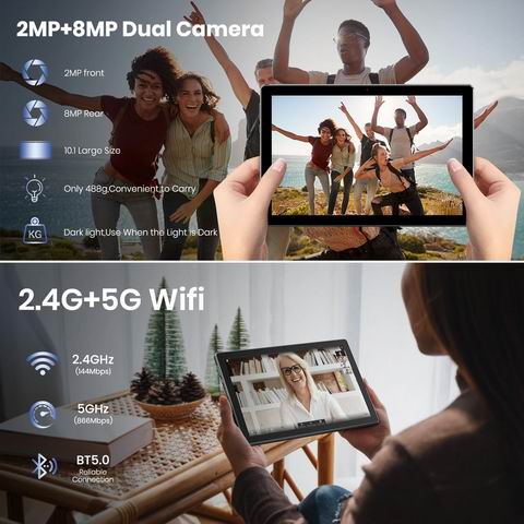 采用10.1英寸1080p IPS全高清屏,运行Android 15系统,搭载八核处理器,配备16GB运行内存与64GB机身存储,并支持最高1TB microSD扩展;前置200万+后置800万双摄满足拍照与视频通话需求。网络方面支持2.4G/5G双频Wi-Fi(含Wi-Fi 6)与蓝牙5.0,支持投屏,并具备Widevine L1以在Netflix/Disney+等平台观看高清内容;同时强调隐私与安全功能,提供1年保修与客服支持,电池续航适合学习、办公与家庭娱乐,作为男女皆宜的科技礼物也很合适。