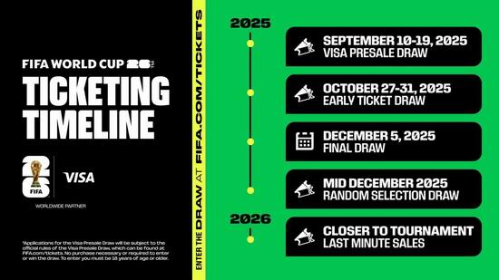 2026年国际足联世界杯(FIFA World Cup 2026)门票首轮预售抽签将于东部时间9月10日上午11点至9月19日上午11点进行,采取“Visa预售抽签”随机抽签方式。中签球迷可购买最多10场比赛、每场4张门票。购票正式开放时间为10月1日。点击进入订票页面。