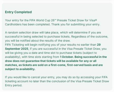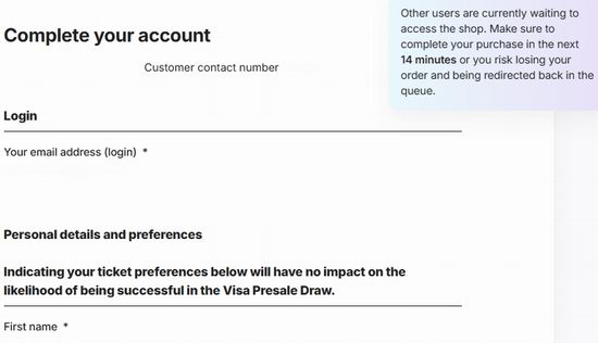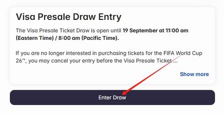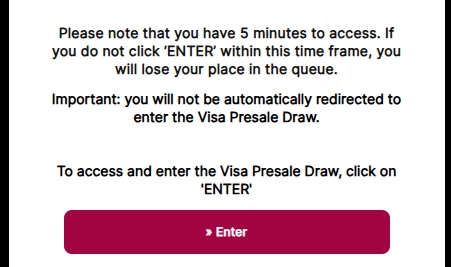 Visa预售抽签阶段不是先到先得,而是通过抽签系统分配门票购买资格。此次抽签活动完全免费,所有成功注册的申请人将在9月29日前获得是否中签的通知。