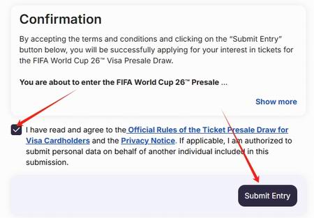 12、阅读并勾选接受条款后,点击“Submit Entry”提交,完成抽签报名。