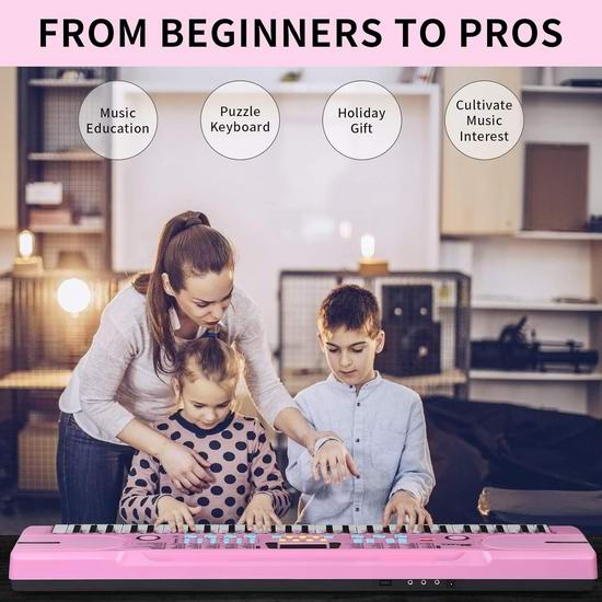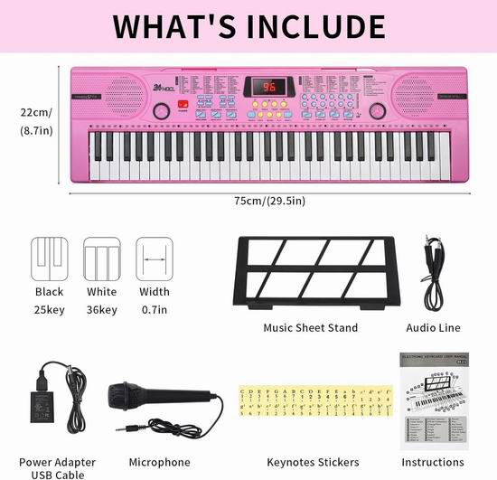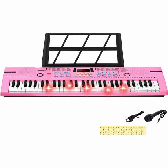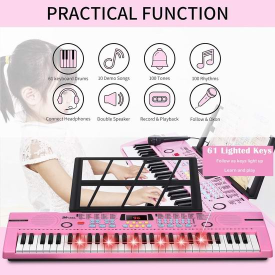 这款61键电钢琴,配有乐谱架、麦克风。具有100种音色,100种节奏,50首演示歌曲,并配备高品质扬声器,使声音简洁而丰富。具有单键、跟随和合奏模式,为新手提供课程。LED 显示屏、麦克风和耳机插孔、带播放功能的录音机以及钢琴音符贴纸可帮助孩子学习读谱。琴键可以开启发光功能,在弹奏的每个琴键都会亮起。灯光提示将根据旋律进行,帮助初学者快速提高演奏能力。