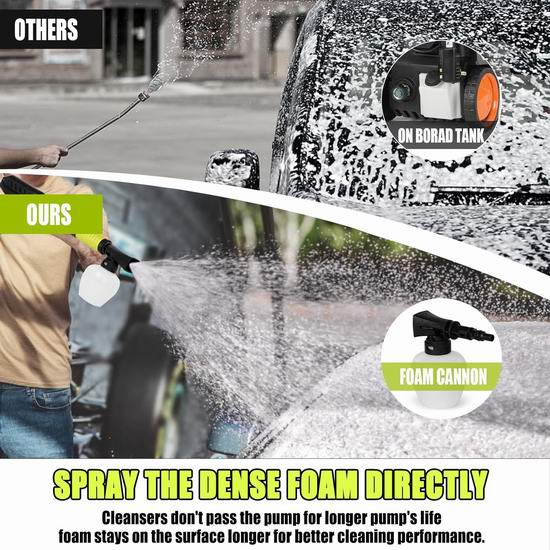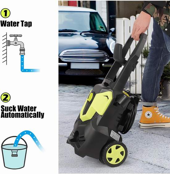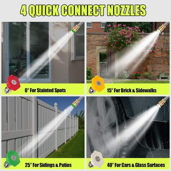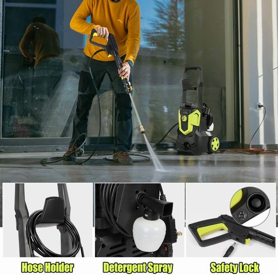 这款电动洗衣机可产生高达1650瓦的功率,提供2500 PSI 和 1.8GPM的最大清洁力,轻松清除焦油、油脂、油渍、铁锈和其他顽固污垢。包含 4 个快速连接喷嘴:0° 喷嘴用于局部清洁或难以触及的区域,15° 喷嘴用于艰难的工作,25° 喷嘴用于通用清洁,40° 喷嘴用于清洁窗户和屏幕,肥皂罐喷嘴用于泡沫喷涂。配备 20 英尺高压软管(金属连接)和 33 英尺电源线,有效避免恼人的漏水。内置自动完全停止系统 (TSS),当扳机未扣动时,系统会自动关闭水泵。安全儿童锁设计,锁定水枪扳机,防止儿童误操作。