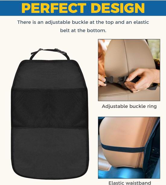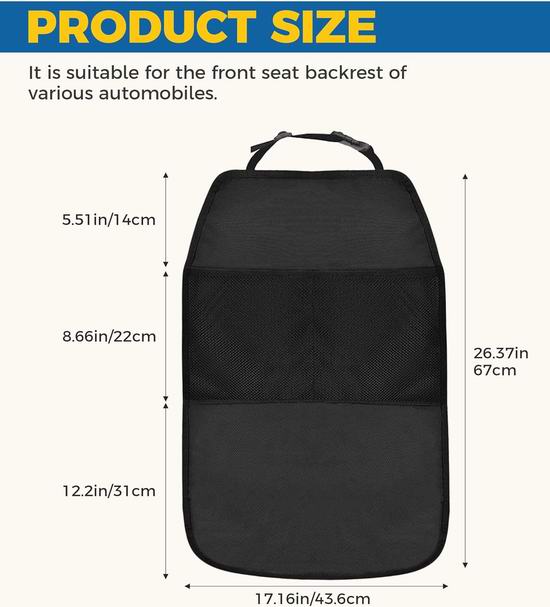 采用优质皮革+涤纶+网布材料制成,防水防尘,不易损坏,易于清洁,可长期使用。可用于保护汽车座椅靠背免受踢踹、弄脏和损坏,还可用于整理汽车后座并存放杂物。设有两个大容量储物网,保持车内空间整洁。安装简便,使用登山扣和绑带即可将其牢固地固定在前排座椅上,适用于大多数轿车、卡车、SUV等车型。