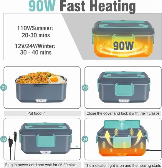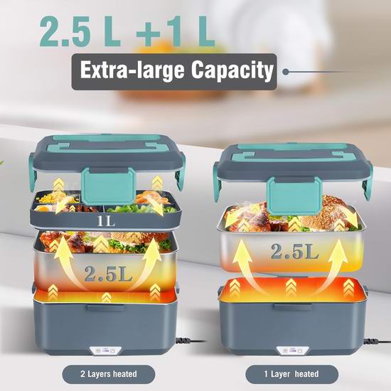这款电热饭盒采用2.5升304不锈钢内胆+1升水果托盘的超大容量设计,满足您丰盛的饮食需求。功率高达90瓦,加热迅速。PTC恒温加热技术比传统的电阻丝加热更均匀、更安全,让您随时随地都能享用如同在家般的温暖美食。饭盒采用双层设计,完美分隔食物,防止串味,可同时加热两层食物,也可选择仅加热单层不锈钢内胆。配备齐全且尺寸合适的304不锈钢餐具。兼容 12V、24V、110V 和 220V 电​​源,让您在车内、卡车里、办公室或家中都能享用热腾腾的饭菜。