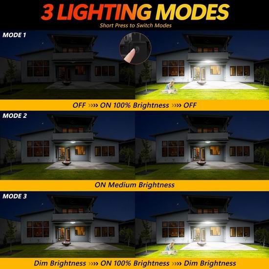 这款太阳能运动感应泛光灯配备2个增强型PIR运动传感器,运动检测能力更强,可在180度范围内检测12米外的运动。配备236颗高品质超亮LED灯珠,可产生3000流明的亮度以及7000K的冷白光,3个可调节灯头确保灵活的角度调节,实现高达270°的广角照明,有效照亮更大的户外空间。内置2000mAh大容量电池,充满电后可提供1300次照明。白天自动充电,夜晚自动工作,能效高达26%。具有3种运行模式:感应模式,常亮模式,调暗至感应模式。