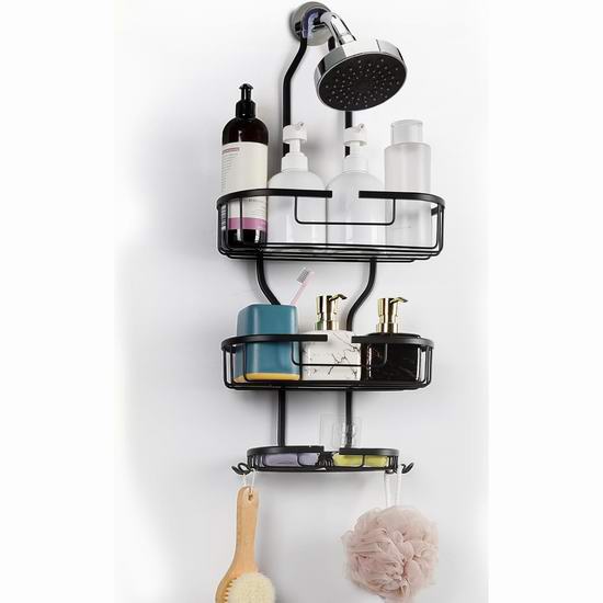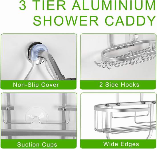 这款悬挂式淋浴架由铝制成,天生防水防锈,与钢或铁不同,具有持久的防锈能力,延长使用寿命。柔性橡胶套可轻松覆盖在各种淋浴喷头上,确保紧密贴合,适应不同尺寸的喷头。精巧的设计提供三层空间,内置挂钩、浴室架和肥皂架,可容纳洗发水、剃须刀、毛巾等所有淋浴必需品。配有2个吸盘和防滑盖,确保安全稳定的安装,无需钻孔或工具,简单组装后即可轻松固定。
