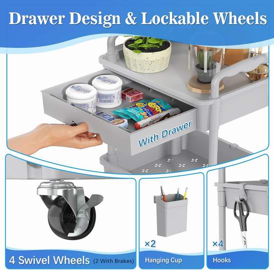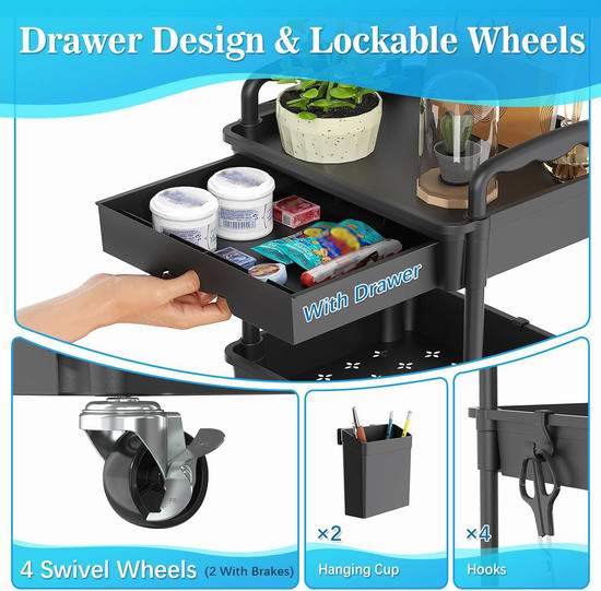 这款可移动储物推车采用三层设计,配有可拆卸抽屉,方便收纳小物件,取用物品也十分便捷。配备可锁定轮子,可在各种表面上平稳移动,同时锁定装置可在静止时确保稳定性。配有额外的挂钩和杯架,可提供额外的存储空间。