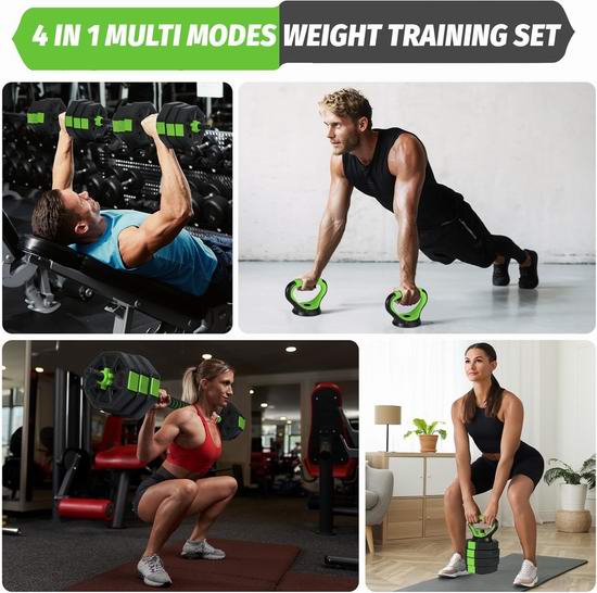 这款4合1多功能健身套装,一套顶哑铃、壶铃、杠铃、俯卧撑架,节省空间还省钱。从二头弯举、深蹲到推举、俯卧撑,一套练全身。健身从此不花冤枉钱,轻松变身肌肉猛男和马甲线女神!通过旋钮调重几秒搞定,安全锁防晃剧烈运动,采用高密度PE外壳+铁沙芯,经久耐用,防滑握柄舒适无味还不滑手。20/30/40kg可调,足以支持肌肉锻炼、塑形、耐力和渐进式超负荷训练。