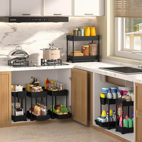 这款黑色4件装水槽下收纳整理架包含两种尺寸(特大号15.6×8.5×13英寸×2;大号13.7×6.7×13英寸×2),可灵活适配厨房、浴室或办公室的水槽下与橱柜狭小空间;单个承重约40磅,适合收纳清洁用品、瓶罐、调料、零食与洗漱用品等。免工具快速组装,底部带排水孔便于防潮清洁;滑动抽屉取物顺畅,无需搬动整架即可轻松拿取,另配挂钩与杯子提升收纳效率,并提供及时客服支持。