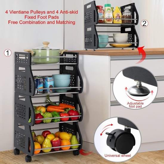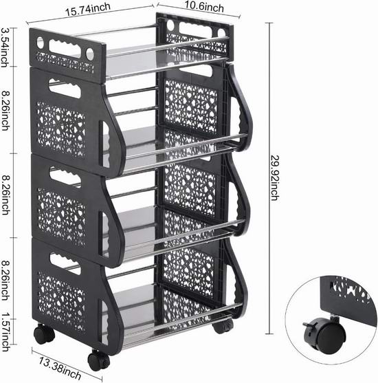 这款四层大容量储物架,可分类存放厨具、餐具、水果、蔬菜、罐头、调味料等。网状中空结构储物篮,促进空气流通,延长食物保鲜时间,避免受潮和变质。采用食品级塑料层板+加厚金属支架,承重力强,不易变形,易于清洁。每层均可单独拆卸,瞬间变成独立的储物篮。配备360°顺畅万向轮,带刹车功能,移动稳定不倾倒。外形尺寸为26.9 x 40 x 76厘米。