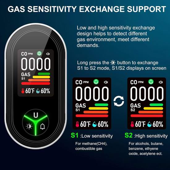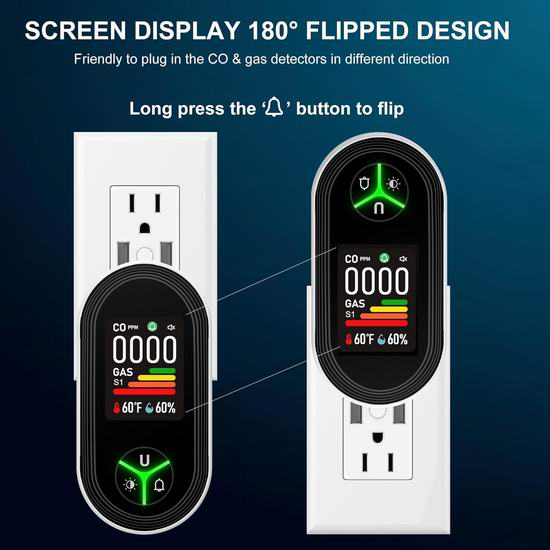 这款4合1探测器集成了一氧化碳、可燃气体、温度和湿度传感器,可实时检测环境气体安全。配备高清屏幕,可实时检测气体环境,通过大图标快速读取数据,例如:一氧化碳浓度(ppm)、可燃气体指示条、湿度、温度、一氧化碳指示器图标和报警状态。一氧化碳检测范围:0-999ppm,当一氧化碳浓度>50ppm时,会发出警报。如果可燃气体浓度超过报警值,探测器会发出警报,警报声高达85分贝,并且气体指示条图标颜色会发生变化。