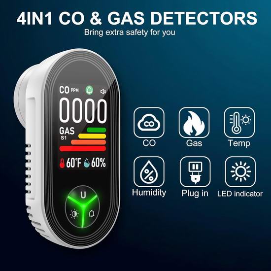 历史新低!Gedsffati 4合1 一氧化碳+燃气+温湿度探测器6折 26.99加元包邮!