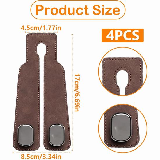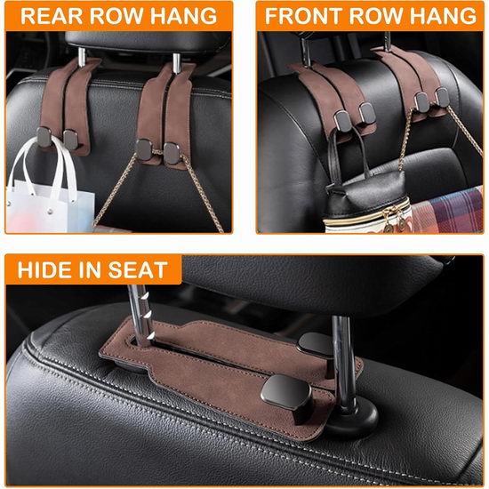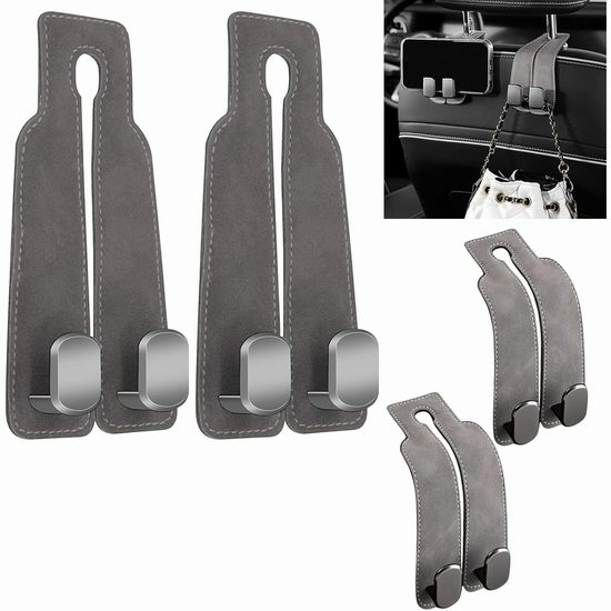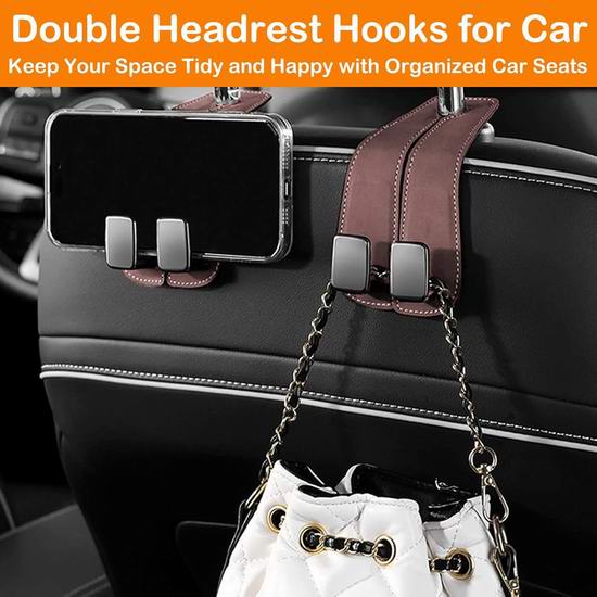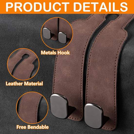 这款汽车头枕挂钩采用弹性皮革制成,耐磨耐用。金属双挂钩可承受更重的负载,确保您拥有更多空间来存放物品。挂钩可弯曲,适合各种座椅,非常适合您在观看视频时固定手机。
