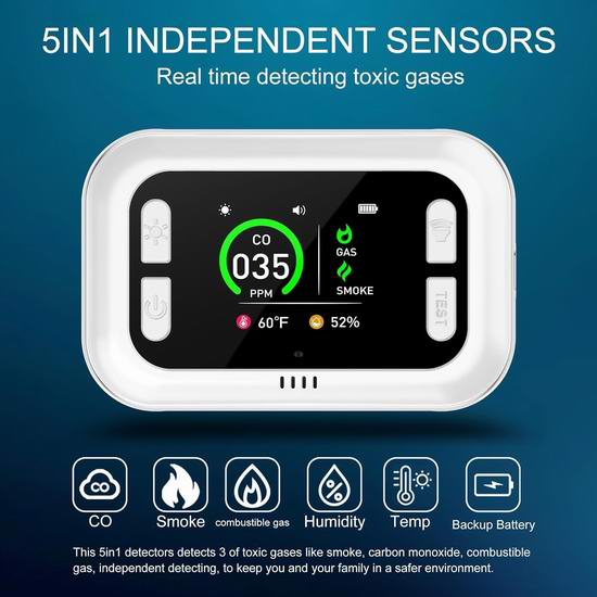 历史新低!Gedsffati 5合1 一氧化碳+烟雾+燃气+温湿度探测报警器5.6折 29.99加元包邮!