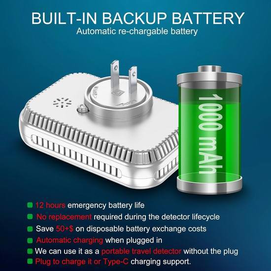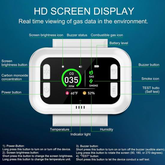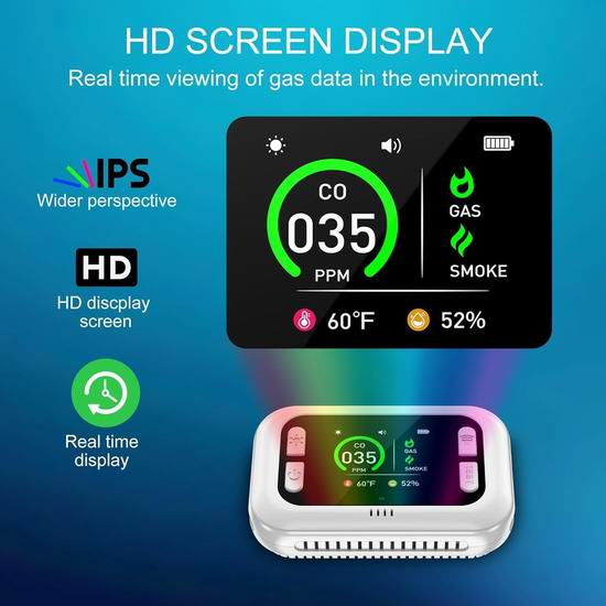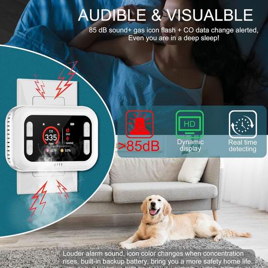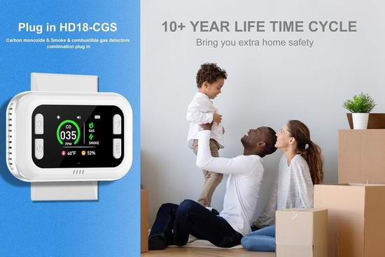 这款探测报警器集成了一氧化碳、烟雾、可燃气体(包含天然气、丙烷、甲烷、煤气、汽油、己烷、丁烷、苯、环氧乙烷、乙炔、液化石油气、液化天然气等)、温度和湿度传感器,可实时检测并提升家居的安全,适用于标准交流电源插座。内置智能显示屏幕,清晰显示一氧化碳浓度、可燃气体浓度、温度和湿度等实时信息。三色指示灯直观地反映空气质量,让您轻松监测环境状况。内置应急锂电池,应对意外停电。