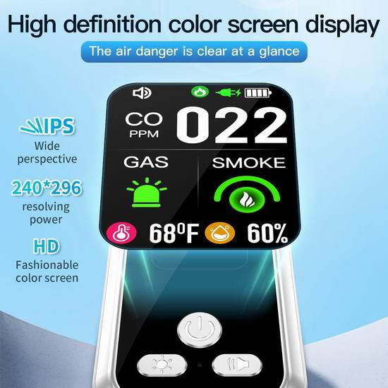 这款探测报警器采用五合一设计,集成了一氧化碳、烟雾、可燃气体(如天然气、丙烷、甲烷、煤气、汽油、己烷、丁烷、苯、环氧乙烷、乙炔、液化石油气、液化天然气等)、温度和湿度传感器,可实时检测环境气体安全。内置2.1英寸高清屏幕,所有数据实时动态显示在高清屏幕上,如CO ppm、烟雾指示条、可燃气体警告图标、湿度、温度、CO 指示图标、插头和报警状态。内置2000mAh应急备用电池,停电时可提供18-20小时续航时间。