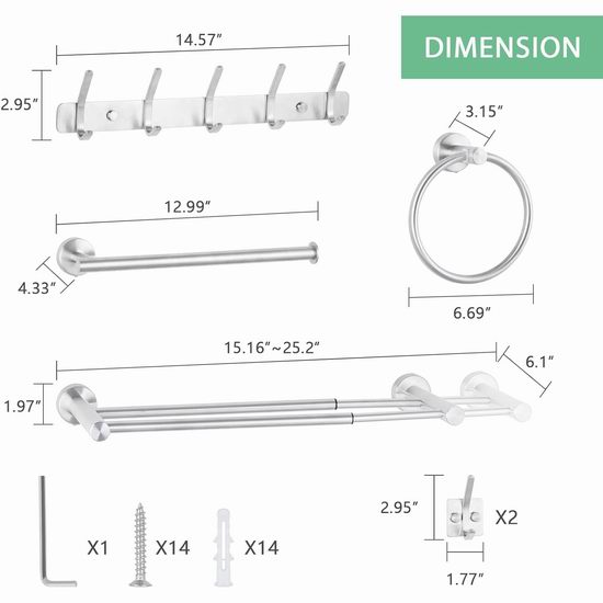 采用优质304不锈钢制成,不会生锈、坚固耐用、不会松动,包含1个可伸缩双杆毛巾架(16.5-23英寸),1个单毛巾架,1个毛巾环,1个排钩和2个小挂钩,可用于浴室、厨房、洗衣房悬挂物品。