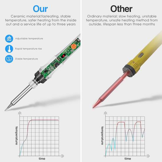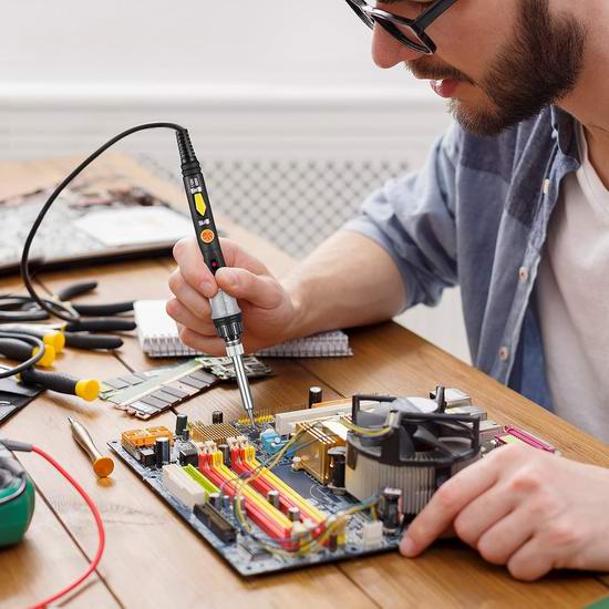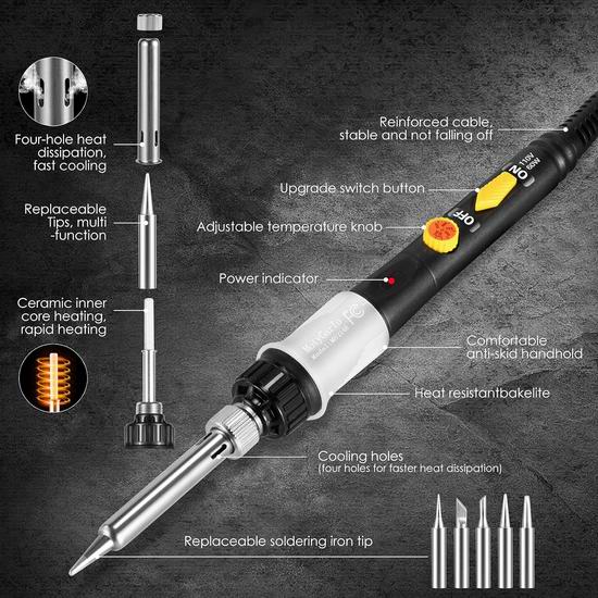 这款8合1电烙铁采用加热陶瓷技术,可在 30 秒内快速加热。通过烙铁上的温度旋钮,可以将温度从200℃ 调节至 450℃。钢管上设计有四个通风孔,增强散热效果。耐热手柄能有效隔绝温度,使电烙铁更适合长时间焊接和维修工作。套装包含电烙铁、5个不同规格的烙铁头、锡丝管和烙铁架,可用于焊接电路板、电器维修、家庭DIY焊接、工艺品制作、电器、电子电气维修以及其他焊接工作。多个替换烙铁头均具有抗氧化性,即使浸入水中也不易生锈。