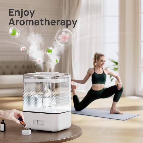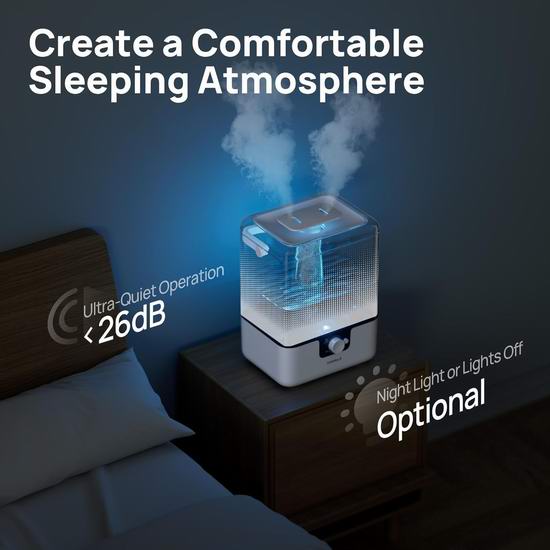 这款加湿器采用双进风设计,最大加湿速率达300毫升/小时,快速释放的超细雾气可缓解干燥不适。特别设计的精油盒可容纳添加精油的化妆棉,将香氛散播到空气中,让房间充满令人放松的香气。具有6升大容量水箱,在最低输出模式下可连续加湿50小时。当水箱缺水时,它将自动停止工作。运行噪音低至 26dB,无需担心影响睡眠。柔和的可关闭蓝色夜灯,营造出宁静的氛围。顶部注水设计经过优化,可直接向水箱注水。加湿器水箱易于拆卸,开口大,配有清洁刷,方便拆卸和清洁。