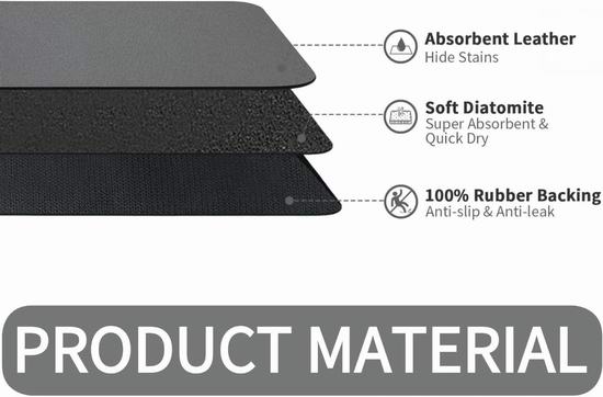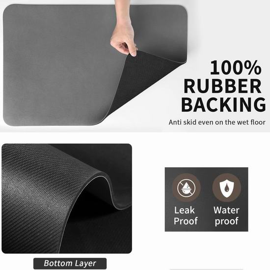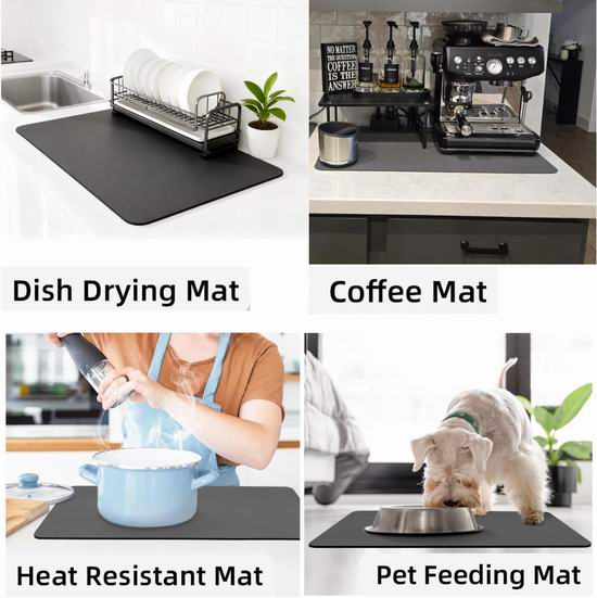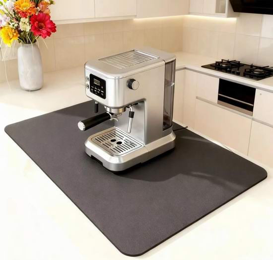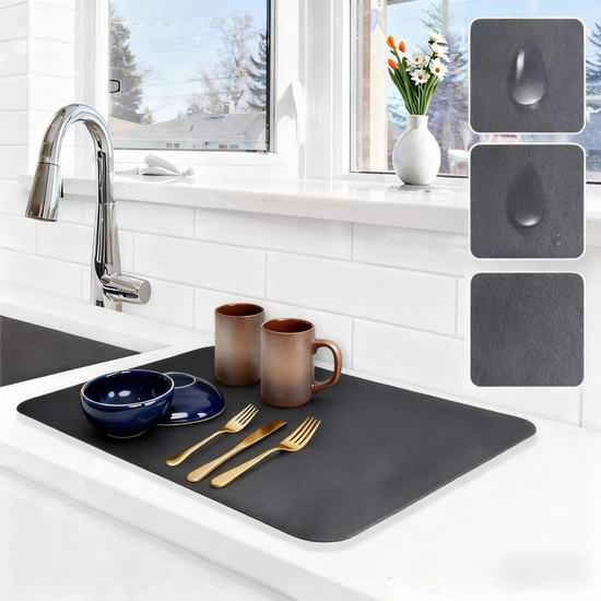 这款升级版沥水垫可快速吸收水滴,快速干燥,不仅可以用于餐具沥水,还可以用来垫咖啡机、豆浆机、饮水机、搅拌机等厨房家电,吸收溅出的咖啡、茶水、果汁、牛奶等液体,保持台面整洁。清洁时,只需用水冲洗即可。背面采用100%再生橡胶底面,防滑耐磨,无异味。尺寸为50 x 30厘米。