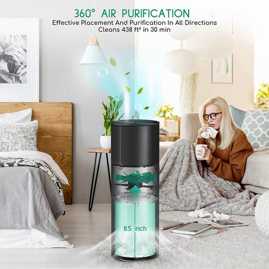 此款空气净化器符合CE和RoHS标准,以及CARB室内清洁设备要求,创新增加可拆式加湿器模块,利用蒸发技术将水转化为纳米水分子来滋润空气,告别干燥,健康呼吸,保护家具和家人健康,让肌肤远离干燥威胁。采用比True HEPA更高过滤等级的日本进口HEPA-H13三级过滤器(预过滤,活性炭过滤,HEPA过滤),实时智能监测室内空气质量调整运行功率,三面环形进风设计,30分钟可净化438平方英尺的空间,支持2/4/8小时定时关闭,滤芯更换提醒。可有效去除99. 99%的空气微粒,小至0.3微米,3档风扇速度可选,全方位清洁空气,包括过敏原、烟雾、花粉、异味、灰尘、烟气,为您提供清洁健康的环境。内置可关闭蓝牙夜灯,2档亮度。