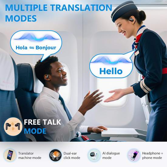 这款AI语言翻译耳机集翻译、通话和音乐于一体,支持实时翻译,配备4种翻译模式、智能语音识别,翻译耳机可即时准确翻译,包括英语、中文、法语、德语和西班牙语等150种语言。翻译耳机可以分析输入内容并回答日常或专业问题(例如如何撰写会议纪要);耳机+手机模式:一人双击耳机,另一人按下手机按钮即可实现流畅对话;翻译模式:类似于传统翻译器,通过手机扬声器输出;自由通话模式:无需点击耳机即可开始对话。耳机纳米硅胶涂层,柔软安全,长时间佩戴无压力,兼顾环境感知和高效通讯。搭载14.2mm驱动单元,呈现震撼的音效;翻译耳机采用先进的录音技术,确保流畅的翻译,享受清晰的沟通,方便商务会议和旅行。配备充电盒,可提供长达50小时的续航时间。