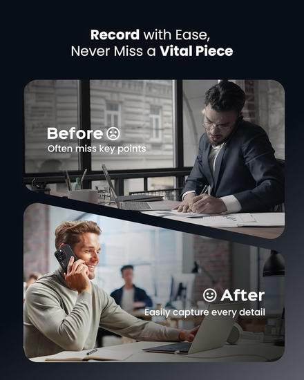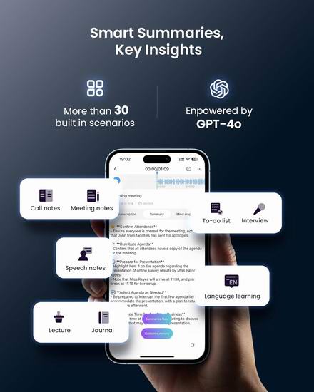 这款智能录音笔,采用ChatGPT-4o技术,可快速准确地转录121种语言的内容,并针对30多种场景生成摘要,助您节省时间,提高效率。支持无限次转录和AI智能摘要功能,无任何隐藏费用或时间限制。提供免费的入门套餐和灵活的订阅模式,满足不同用户层次的需求。内置振动和空气传导传感器,确保卓越的音质清晰度。AI驱动的降噪技术增强了在嘈杂环境中的语音识别能力,让您无论是在拥挤的房间还是户外,都能清晰地捕捉到每一个字。内置 64GB 内存,可存储长达 480 小时的录制内容。多余的文件还可以上传到云端。您的数据在本地和云端均经过安全加密,确保只有您可以访问您的文件。内置3000mAh大容量电池,单次充电即可支持长达80小时的连续录音。无线充电功能确保您随时待命,并在紧急情况下为您的手机提供备用电源。适用于各种场景,从商务会议、上课、讲座到采访、个人备忘录和语言学习,都能轻松胜任。