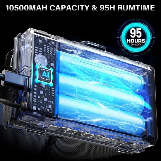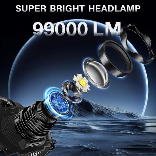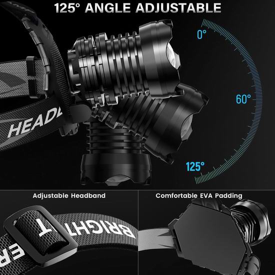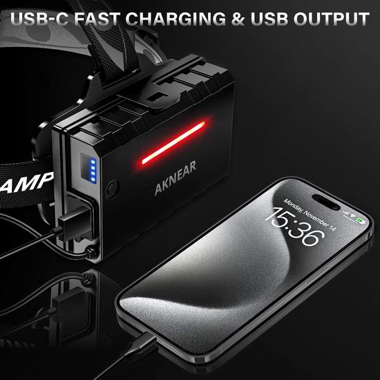 AKNEAR 头灯采用军用级铝合金制成,可承受高空跌落冲击;LED头灯具备暴雨防水等级,可在各种恶劣天气条件下正常工作。采用超亮 XH-P90.8 芯片,照明距离可达1680米,10分钟后自动开启节能模式,灯泡寿命长达10万小时。具有泛光和聚光两种模式,两种模式下均有 5 种亮度模式:高/中/低/频闪/SOS。LED 头灯电池盒还带有红色背光功能(常亮/闪烁),可在夜间警示后方人员。头灯角度可在0°至125°范围内调节,让您拥有全方位视野。内置10500mAh大容量可充电电池,附带 USB-C 快速充电线,充电时间仅需3-4小时,高亮度模式续航约8-10小时,低亮度模式续航超过65小时,待机时间可达95小时以上。内置USB电源输出口,可在紧急情况下用作移动电源为手机或其他设备充电。头灯电量显示为 25%/50%/75%/100%,通过电量显示可以更直观地查看充电状态和剩余电量。