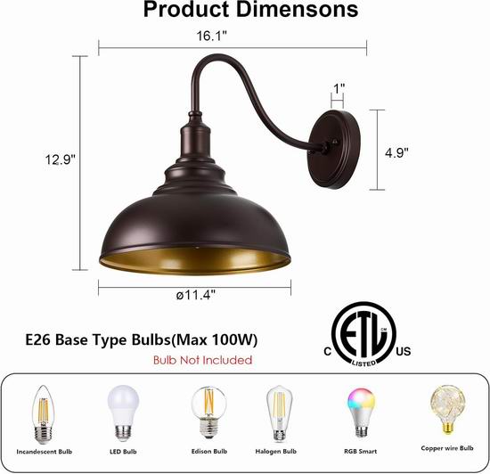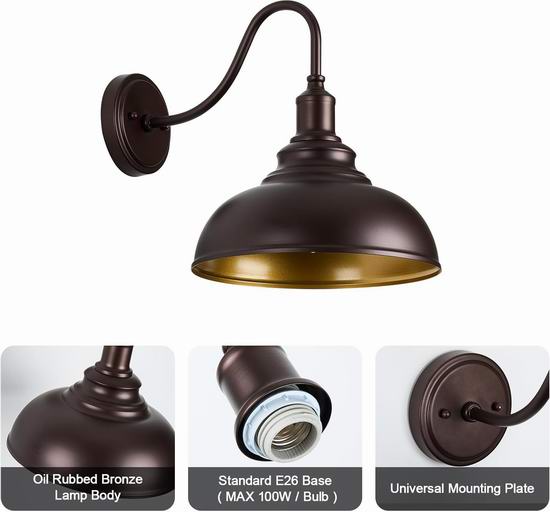 这款户外壁灯的设计灵感源自穹顶,防水、防锈、防腐蚀,适合任何天气条件。圆形背板和灯罩采用金属材质。鹅颈油擦青铜户外灯具采用开放式底部设计,方便更换灯泡。看着最大功率60W的LED灯、白炽灯、CFL和卤素灯(不包含)。套装包含所有安装硬件,只需几分钟即可安装。