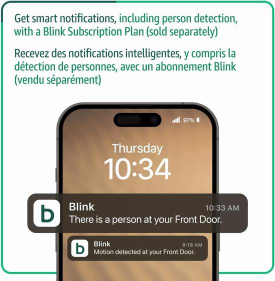 这款Blink第四代智能摄像头和第二代可视门铃,使用随附的AA锂电池(可更换)和Blink Sync模块,两台设备均可享受长达两年续航时间。支持通过 Blink 应用程序查看高清视频和双向通话,支持红外夜视,随时随地掌握门外动态,让您日夜都能清晰地看到访客和包裹的送达情况。Outdoor 4 采用双区增强型运动检测技术,视野更广阔,运动警报速度更快。赠送30天云储存订阅。