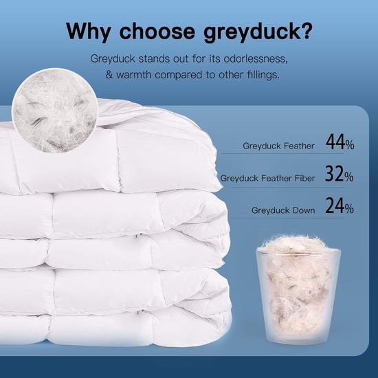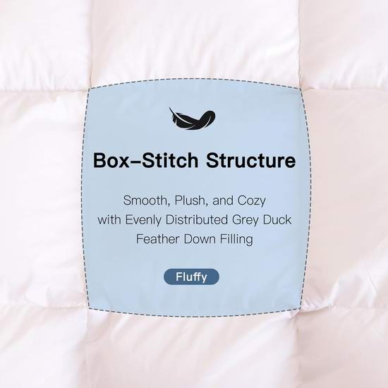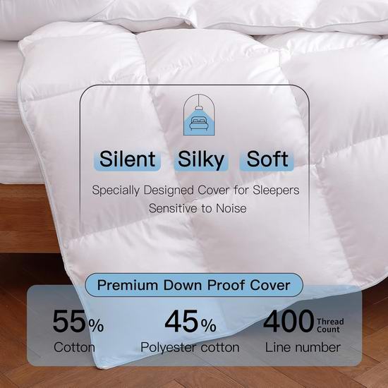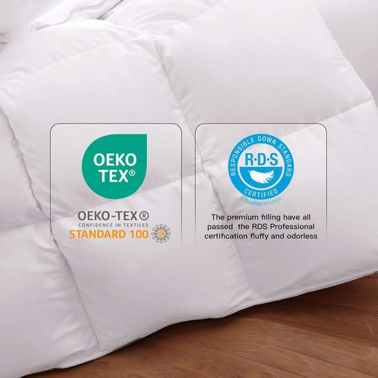 采用奢华蓬松鸭绒填充,通过RDS认证,极致保暖,蓬松柔软,无异味,提供如云朵般舒适柔软的极致睡眠体验。被套采用400支高密度55%棉和45%涤棉混纺面料,触感如丝般柔滑,防绒,有效降低噪音。被套采用8个角袢带和方格缝制工艺,确保填充物均匀分布,透气性佳,蓬松柔软。