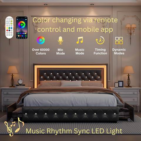 这款PU 软包床架融合 LED 情境灯光与实用储物设计,配备菱形绗缝可调节床头板,并支持遥控或手机 App 调节灯光颜色、亮度与音乐同步,轻松打造个性化卧室氛围。床架下方设有四个带金属框架与顺滑滚轮的大容量储物抽屉,方便收纳床品与衣物。可调节床头板适配 8–14 英寸床垫,提供更舒适的靠背体验。坚固的金属结构搭配 11 根木板条,无需弹簧床垫即可提供稳定支撑。整套床架安装简单,附带工具与说明书,并提供客户支持,是兼顾美观、功能与耐用性的理想卧室家具选择。