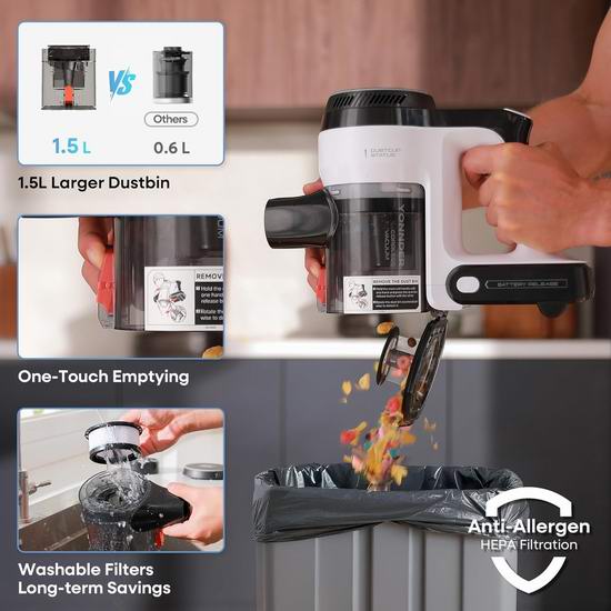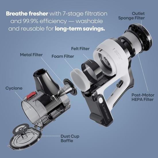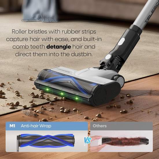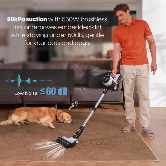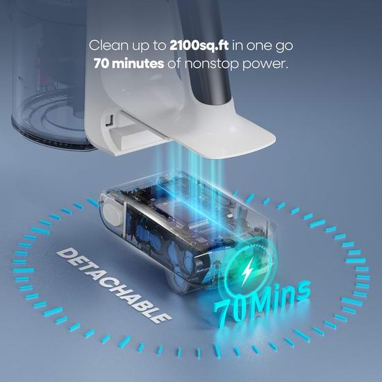 AlloyMove A01 无绳吸尘器配备550W高品质无刷电机,可提供50KPA强劲吸力,能深入地毯缝隙,轻松去除硬地板上的顽固灰尘、宠物毛发和碎屑。强劲的吸力搭配超宽地板刷,为您带来高效强劲的清洁体验。直观的LED显示屏清晰显示4种工作模式和电池状态,操作简便。吸尘器在硬地板模式下单次充电即可实现长达70分钟的超长续航,可拆卸电池支持单独充电,仅需4小时即可充满。吸尘器采用独立站立设计,只需关闭电源按钮即可停止清洁,放置时无需担心倾倒。配备升级版V型滚刷,带有橡胶条,可防止宠物毛发和长发缠绕,有效解决毛发缠绕的烦恼。明亮的绿色LED灯可照亮黑暗角落中隐藏的细小灰尘。吸尘器采用7层过滤系统,可有效捕捉空气中99.99%的细小灰尘颗粒。可水洗滤芯不仅节省更换成本,还能改善室内空气质量。