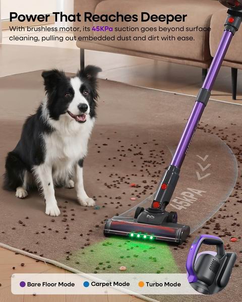 这款 AlloyMove A03 无绳吸尘器 搭载 450W 无刷电机,提供高达 45kPa 的强劲吸力与三档调节,轻松应对地毯深层灰尘与宠物毛发;机身仅约 1.3kg,配备可拆卸电池,最长续航达 60 分钟(可扩展至 120 分钟),无线清洁覆盖大户型无压力;V 型防缠绕滚刷、180° 平躺与 90° 自立设计让清洁更省力,搭配绿色 LED 探照灯精准照亮隐藏灰尘;1L 大容量集尘盒一键倾倒,HEPA 滤网可水洗重复使用,并提供 2 年质保与全天候客服,是家庭、宠物家庭和地毯地板清洁的高效之选。