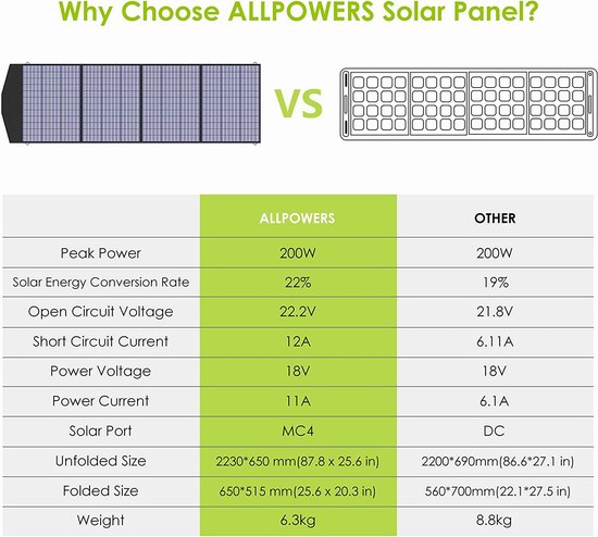 采用美国制造单晶硅制成,具有高达22%的光能转换效率,最大输出功率高达200瓦,可以折叠,易于安装,用途广泛,带3条输出线缆,不仅可为大多数备用电源、汽车电源、房车电源补充电力,还可以为笔记本电脑提供电力。折叠后尺寸仅为25.6x20.3x2.4英寸,重量13.9磅。